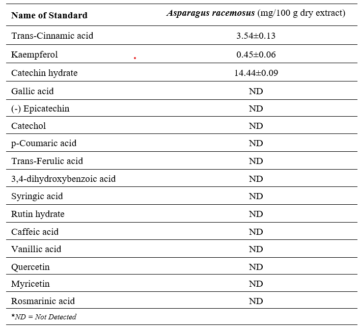 Quantitative analysis of selected polyphenolic constituents in the ethanolic extract of Asparagus racemosus was performed using high-performance liquid chromatography coupled with diode-array detection (HPLC-DAD), following the protocol outlined by Ahmed et al.[31], with slight procedural adjustments. The chromatographic separation employed a binary mobile phase system comprising 1% acetic acid in acetonitrile (Solvent A) and 1% acetic acid in water (Solvent B). The gradient elution profile was programmed as follows: 5–25% A (0.01–20 min), 25–40% A (20–30 min), 40–60% A (30–35 min), 60–30% A (35–40 min), 30–5% A (40–45 min), and maintained at 5% A (45–50 min). A sample volume of 20 μL was injected per run, with a constant flow rate of 0.5 mL/min. Detection was carried out at 270 nm to ensure method validation and compound identification. Prior to use, the mobile phase was filtered through a 0.45 μm nylon membrane (India) and degassed under vacuum conditions.