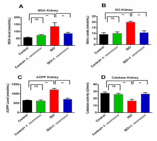 Biochemical analysis demonstrated that isoproterenol (ISO) induced renal dysfunction, as reflected by significant elevations in serum creatinine, uric acid, and oxidative stress markers such as increased levels of lipid peroxidation (MDA), nitric oxide (NO) and advanced oxidation protein products (AOPP). These changes are consistent with impaired renal clearance and free radical-mediated injury [45, 48]. Notably, treatment with A. racemosus extract markedly reduced uric acid and creatinine levels, suggesting an improvement in glomerular filtration and renal functional status. The restored catalase activity suggests that the extract strengthens the body's natural antioxidant defenses, possibly by boosting enzyme function or neutralizing free radicals directly [49, 50]. The significant reduction in myeloperoxidase (MPO) activity further supports its anti-inflammatory potential, indicating reduced neutrophil infiltration and tissue damage [51, 52]. The reduction points to be dampened inflammatory response, which may be critical in preventing progression to chronic kidney damage [53, 54].