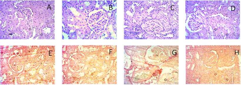 For microscopic examination, excised kidney and heart tissues from experimental rats were initially fixed in 10% neutral buffered formalin (NBF). The fixed specimens were then dehydrated through a graded ethanol series, cleared with xylene, and embedded in paraffin to prevent air entrapment. Thin sections approximately 5 µm in thickness were prepared using a rotary microtome and mounted onto clean glass slides. These sections were stained with hematoxylin and eosin (H&E) to assess inflammatory cell infiltration. Additionally, Picrosirius Red staining was performed to visualize and evaluate fibrotic alterations. All stained slides were imaged and analyzed under a light microscope (Zeiss Axioscope) at 40× magnification.