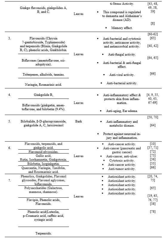 - Noor-E-Tabassum; Das, R.; Lami, M. S.; Chakraborty, A. J.; Mitra, S.; Tallei, T. E.; Idroes, R.; Mohamed, A. A.-R.; Hossain, M. J.; Dhama, K.; Mostafa-Hedeab, G.; Emran, T. B. Ginkgo biloba: A Treasure of Functional Phytochemicals with Multimedicinal Applications. Based Complement. Alternat. Med. 2022, 2022, 1–30. https://doi.org/10.1155/2022/8288818